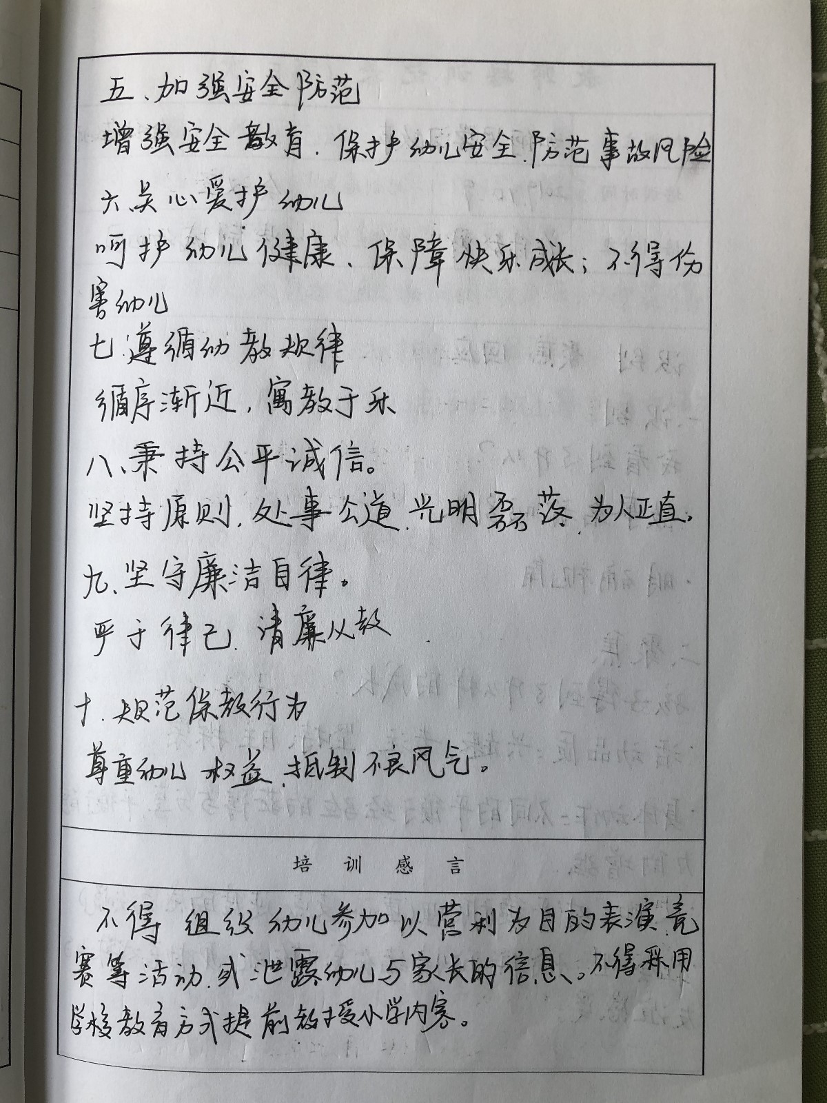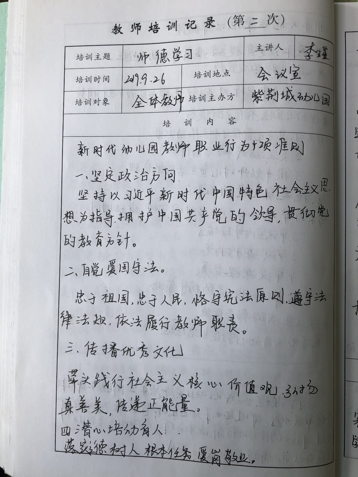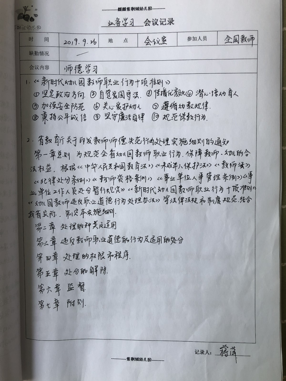 “捧着一颗心来,不带半根草去”爱与责任同行,爱心是师德的制高点,责任是师德的重点。幼儿教师是人生的第一位启蒙老师,是教幼儿如何做人的先行者,正所谓德高为师、身正为范。南京市江宁区麒麟紫荆城幼儿园贯彻学习 《教育部印发教师职业行为十项准则》于2019年9月25日中午召开师德师风会议,贯彻学习自重、自省、自警、自励、自觉做以德立身、以德立学、以德施教、以德育德的楷模,维护教师的职业形象,提振师道尊严。