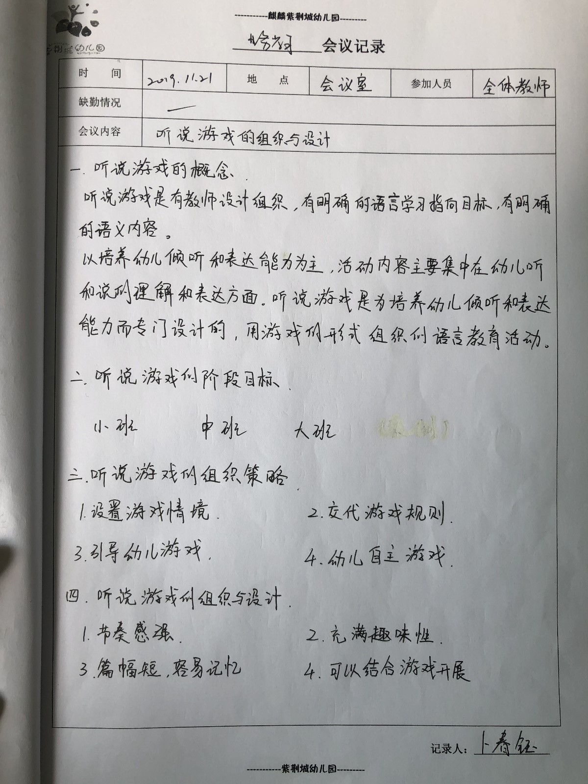 为了更好地落实《3~6岁儿童学习与发展指南》精神,进一步落实幼儿园课程游戏化教学的建设和实施,提升幼儿园内涵发展与课堂教学提升,幼儿园就语言领域中听说游戏,于11月21日开展园本教研活动。
